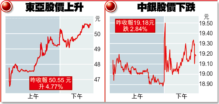 【本報訊】中銀香港(2388)斥資39.5億元入股東亞銀行(023)4.94%股權,市場反應不算正面,兩股昨日早段跟隨大市下跌,東亞一度挫近4%,午市時反彈,收報50.55元,升4.8%;中銀則全日下跌2.8%,收報19.18元。