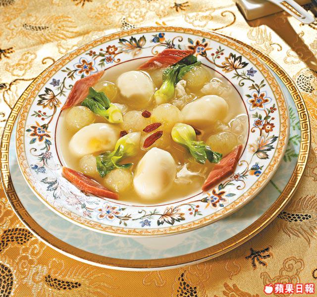 3.燒滾上湯後下金華火腿,將鴿蛋及冬瓜球煨5分鐘入味;雪耳及小棠菜灼熟上碟,最後放上杞子點綴即可。