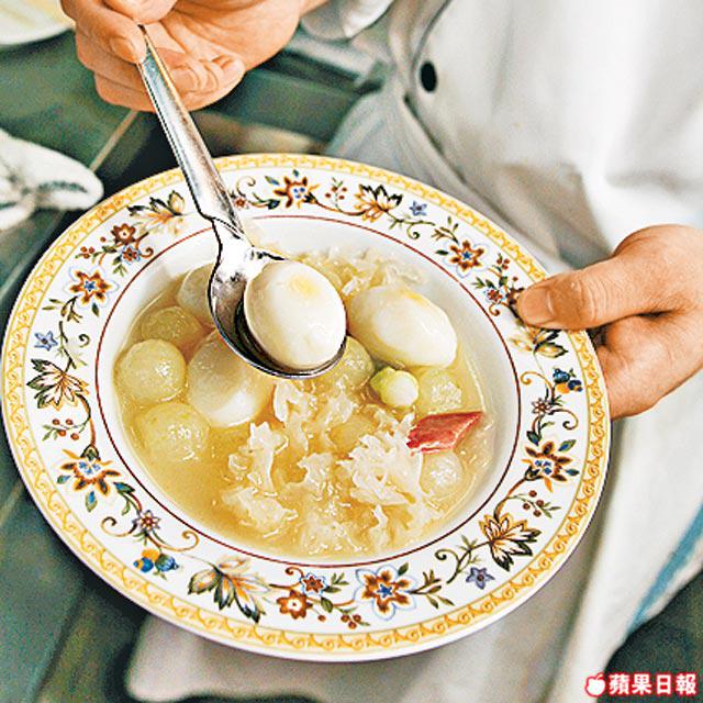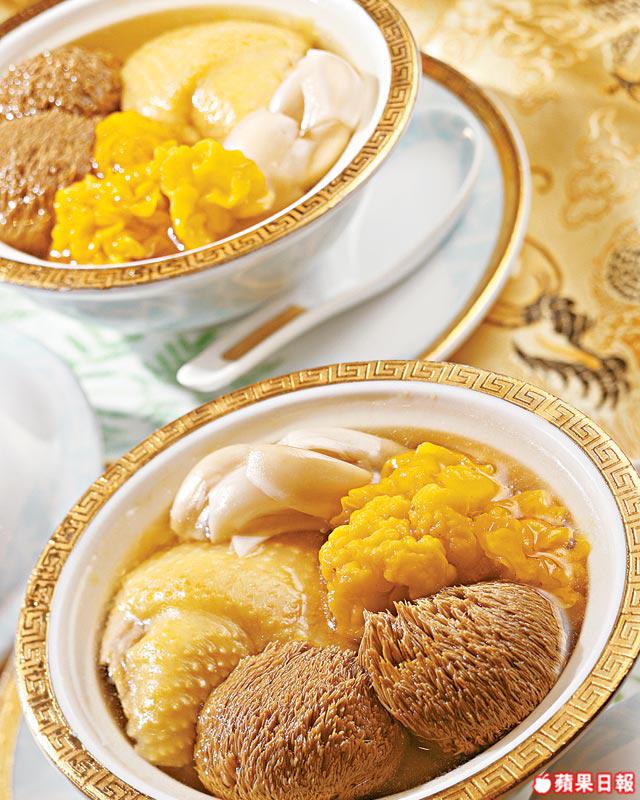 「合歡湯」一名出現在《紅樓夢》,取闔家團圓之意,以龍江雞、猴頭菇、鮮百合燉成,湯味清甜甘美,濃而不濁。