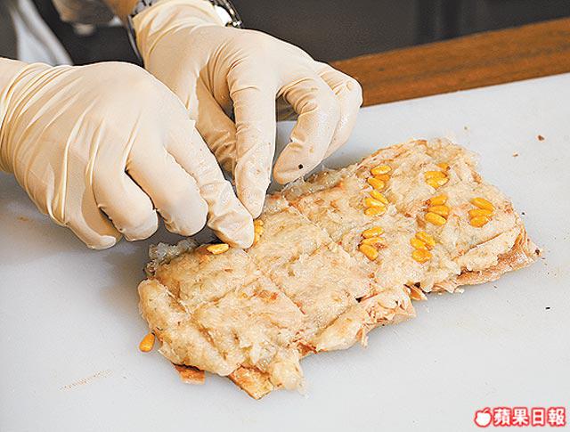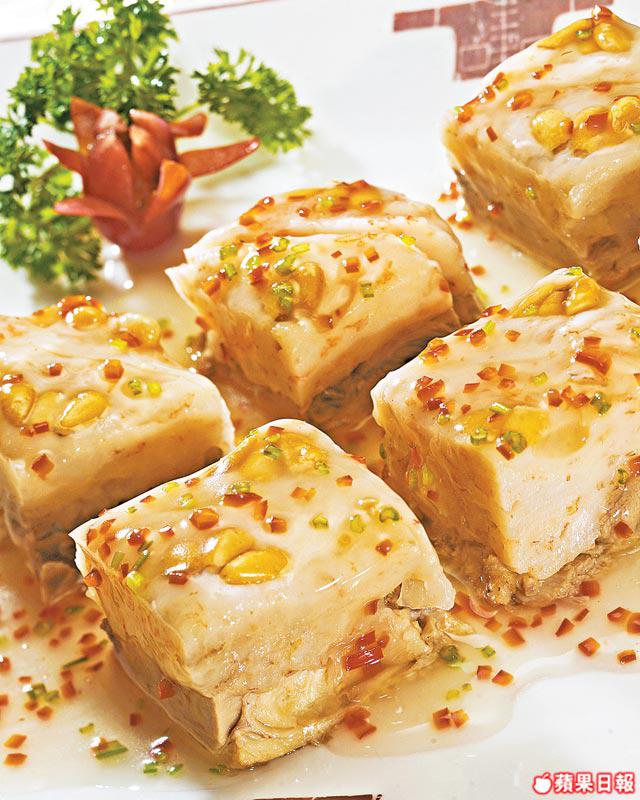 2.蝦膠以少許鹽調味;鴨肉撲上生粉釀上蝦膠,鋪上松仁蒸10分鐘後切件。