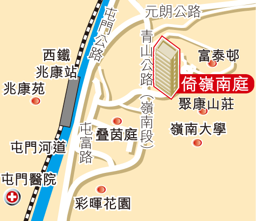 物業大閘外對面馬路,有巴士及小巴站,主要來往西鐵兆康站及屯門市中心,購物飲食可到附近公屋富泰邨商場,有街市、郵局、超市、銀行、餐廳、便利店、報紙檔及其他小商店,足夠應付日常所需,步行前往約需5至8分鐘。