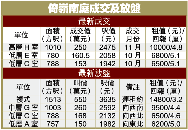 他續說,毗鄰的聚康山莊屬小型屋苑,共建4座提供684個單位,但分層戶最大僅801方呎,現樓價200萬至210萬元,為數極少的頂層相連戶,面積1121至1316方呎,二手放盤呎價逾4100元。同區樓價指標的卓爾居,最大單位僅928方呎,但現樓價245萬至380萬元,遠高於倚嶺南庭。