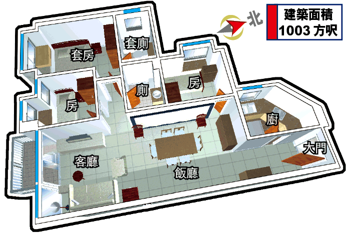 單位面積1003方呎,露台38方呎,為區內數一數二的新廈大露台,窗台面積25方呎不算過份,但要注意廚房外約7方呎的冷氣機平台,亦計入單位面積內。玄關長,但夠闊,可放鞋櫃;闊落的大廳予人置身千呎戶的實在感覺;其中一房設於飯廳旁,走廊較短,無減內櫳實用性。