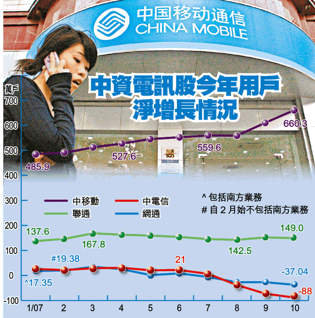 【本報訊】中電信(728)及網通(906)兩大內地固網商昨公佈10月份客戶增長情況,與市場預期一樣,受移動替代固網的速度加快,再錄得客戶淨流失。中電信固網客戶淨流失88萬戶,是連續第三個月;網通則第四個月出現,淨流失37.04萬戶。但在市場憧憬國內加快向固網商發出3G牌下,兩公司股價昨續大升,當中以網通升11.11%最凌厲。