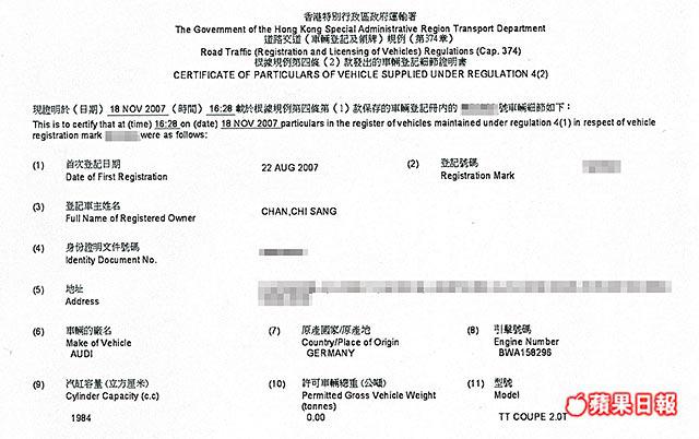 前晚崔建邦駕車離開將軍澳電視廣播城,被問到換車一事時說:「係朋友借嘅。」但他拒絕進一步透露資料,而根據汽車登記文件顯示,該部跑車的車主名為ChanChiSang,並非崔建邦本人,看來他與陳姓的友人特別有緣。