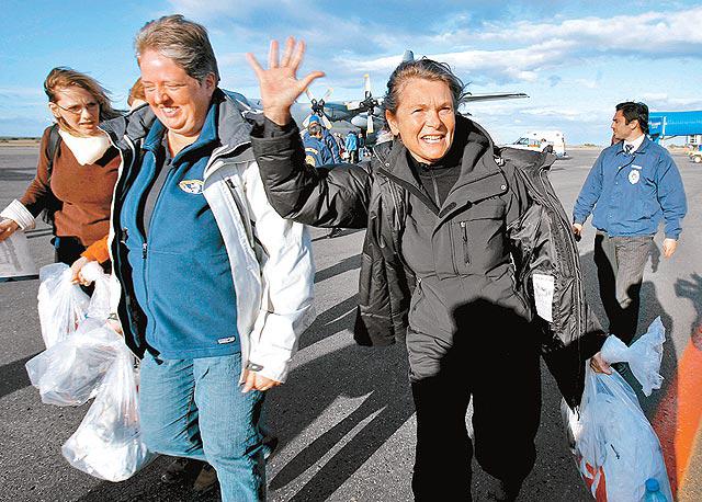 經過近40小時的折騰,77名乘客前天乘坐智利C-130大力士運輸機,從南極洲喬治王島(KingGeorgeIsland),飛抵智利蓬塔阿雷納斯(PuntaAreans)。大夥兒中有香港來的余美霞和CaryLiu。上機時,余美霞在南極背起隨身物品準備上機時,臉容還有點繃緊。下機時,大家臉容放鬆了,CaryLiu還向着鏡頭,做了一個陪伴港人走天下的手勢──V字手勢。
