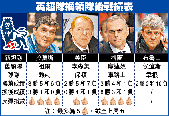 英超開季不論富有大球會或小球會,均頻頻換領隊求反彈。雖然曼聯領隊費格遜、歐洲足協會長柏天尼等球圈重量級人士,先後批評球會「炒人」太狠,但從戰績看來,換領隊的確有作用。