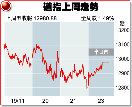 道指上周五收報12980點,升181點或1.42%;納斯達克綜合指數漲34點或1.34%,收報2596點;標準普爾500指數則升23點或1.69%,收報1440點。