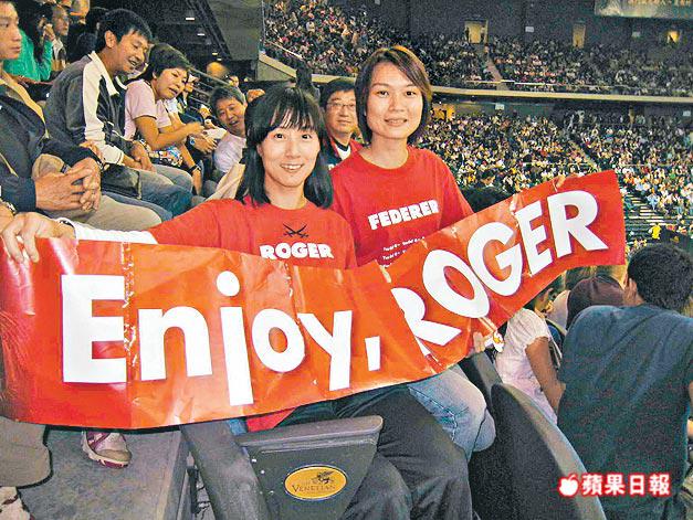 要數費達拿最忠實fans,首推昨晨從香港搭船到威尼斯人的Ellen(圖左)及Maggie(圖右)。兩人為了支持偶像,特別做了兩件紅色tee,印上費達拿英文名Roger及Federer,還做了大型橫額;問兩人喜歡費達拿甚麼,她們說:「他球技了得,又靚仔又好人,對女友又忠心。」