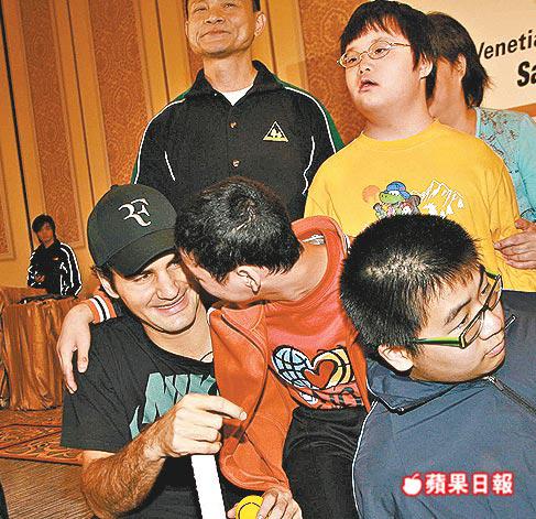 費達拿與森柏斯在澳門逗留不足48小時,但昨晨仍抽空與澳門弱智人士打網球。在合照時,一名穿橙衫的男孩不但搭實費達拿膊頭,還想向他索吻(圖)!「好好先生」費達拿即笑問:「你想怎樣?」他婉拒了那位男孩的盛情,身旁的保安也隨即拉開該男孩的手。