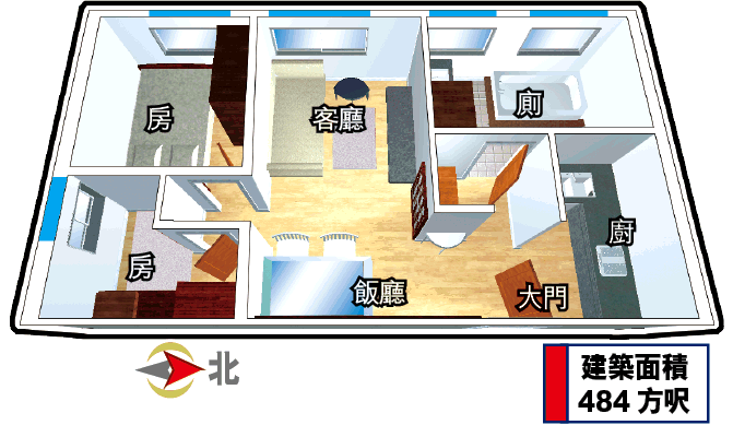 事實上,全屋裝飾擺設如新盤示範單位一樣,花紋大鏡、無縫木地板、全新廚廁設備及典雅的歐陸式家具等,僅欠缺電視、雪櫃、洗衣櫃等大型家電,對於面積僅484方呎,樓齡達23年的居屋而言,這套裝潢,着實為單位大大提升價值。