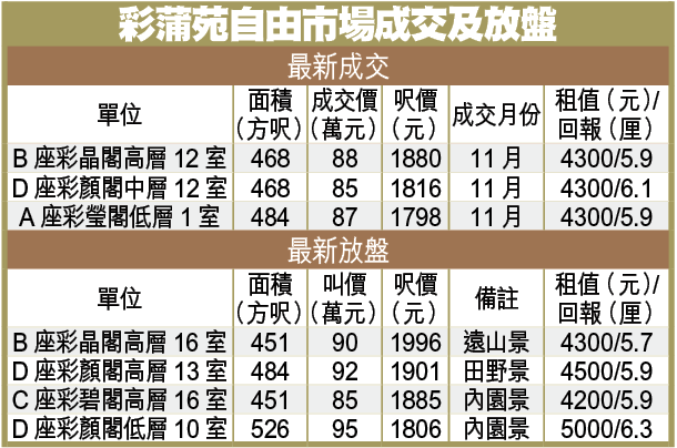 新界北區居屋入場費低,即使包括補地價成本,呎價僅2000餘元已有交易,其中平霸之選,非上水彩蒲苑莫屬,400餘方呎單位售價普遍低於100萬元,以八九十萬元的樓價入市,即使加上十萬八萬豪裝,總成本隨時仍低於100萬元,吸引不少上車客或細價貨炒家捧場,而且,屋苑毗鄰東鐵上水站,租務交投活躍,回報普遍近6厘或以上,長線投資亦有市場。
