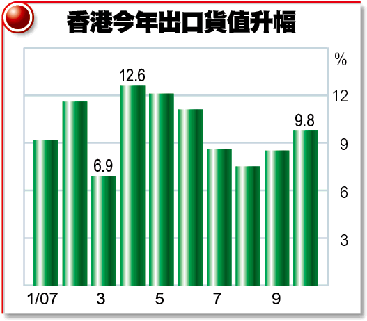 【本報訊】本港10月份整體出口貨值增長9.8%,較市場預期的8%高。有分析指是內地市場持續強勁所帶動,亦有指是去年同期基數較低所致,故難望11、12月能保持接近10%的增幅。