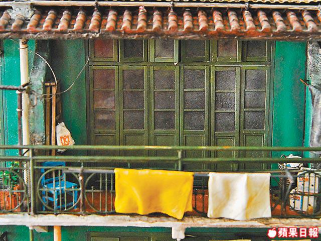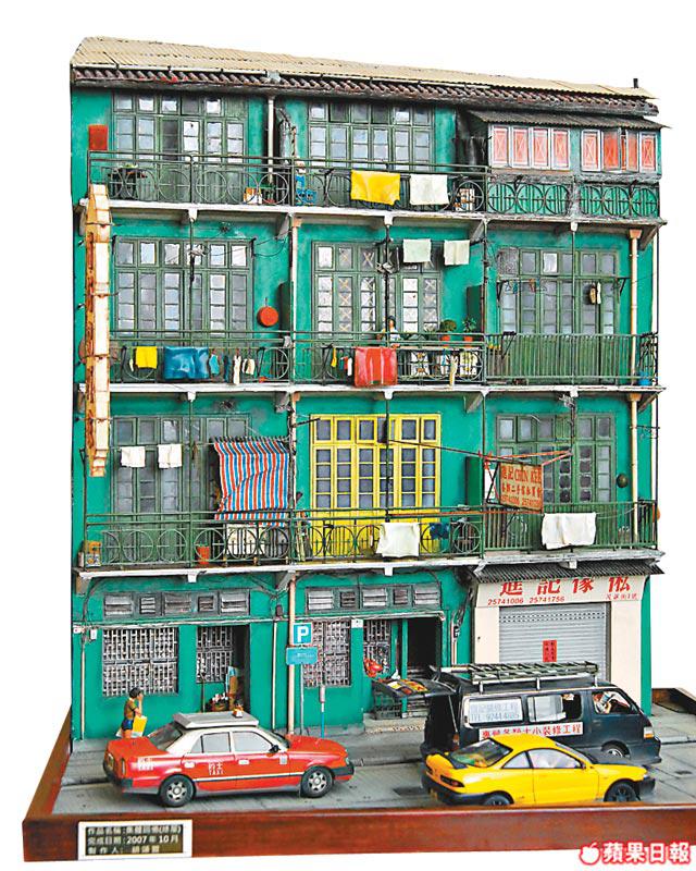 半個人咁高的灣仔綠屋模型,於本年香港公開模型大賽勇奪3個獎項,製作者胡頌盟並沒沾沾自喜,用模型友眼光自評:「玩開模型的人,會知道件作品所花的技巧好基本,着色不像傳統模型方法咁做幾層光暗陰影,而係一塊顏色塗上去。」捨難取易,並非他技巧不及,而是模型的假假真真,複雜如人生,「我見過外國雜誌的模型,種種陰影,拍照出嚟反而有點假。」破格製法,加上在港人眼中鑲了金的「集體回憶」,他的作品不勝才怪。原以為他又會說一大串與綠屋有關的兒時回憶,他卻簡單道:「我想做低下階層的作品,IFC的模型有人會畀錢做啦!」但香港情懷,還是在作品中暗暗滲出,例如以前打風時必見的膠紙「X」窗花、露台僭建廁所等,看着令人會心微笑。