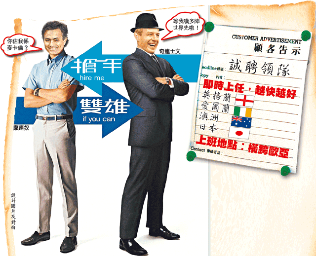 據外電報道,除咗英格蘭打晒鑼鼓搵新領隊外,愛爾蘭、澳洲、日本同南韓,仲有好幾支非洲國家隊都搵緊人,旨在搵個有名氣,又有能力嘅名帥帶隊殺入2010年世界盃決賽周。由於職位多但人才少,只要有你番咁上下料,肯定係招攬對象,唔怪得幾乎所有無帥球隊,都同摩連奴或者奇哥個名扯上關係。