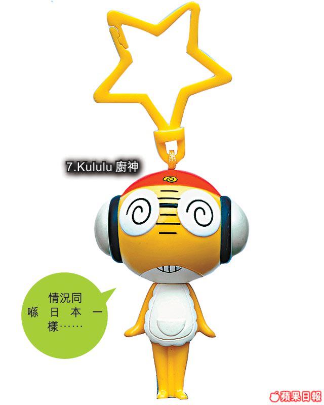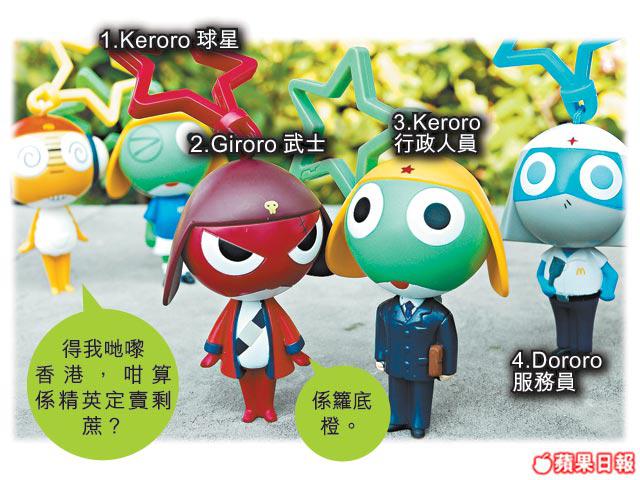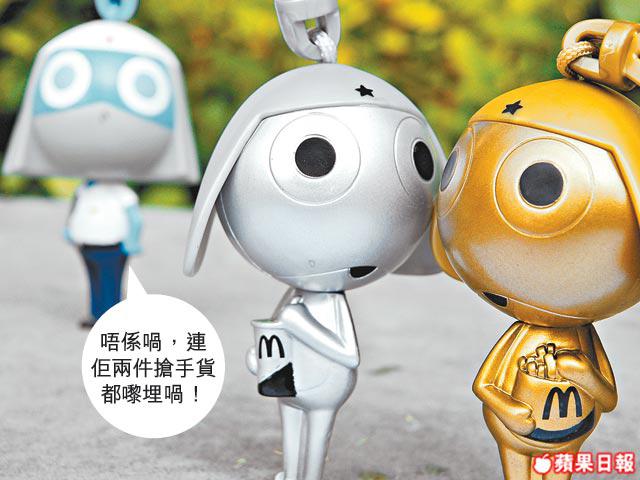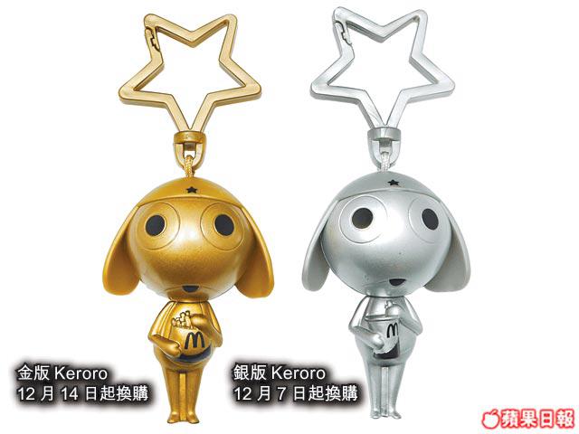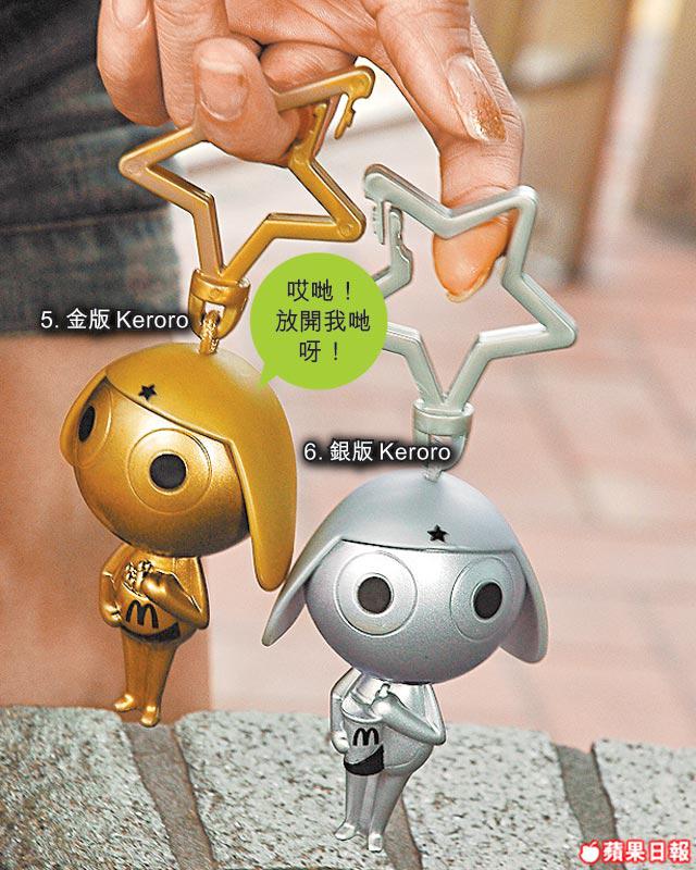 印象中,香港麥當勞只出過一次Keroro玩具,時間是上年8月。極不幸,那次的扭蛋印章,疑引起怪病事件,曾叫家長一時間怕了Keroro玩具。不過Keroro總叫人歡樂的,今次唔同,沒有甚麼印章,是個如掌心大小的匙扣(未計星星扣環),部份角色拿着麥記食物。香港方面有8款於4周內推出,包括Keroro球星、Tamama單車手、Keroro行政人員、Giroro武士、Dororo服務員、Kululu廚神及金光別注及銀光別注版Keroro。