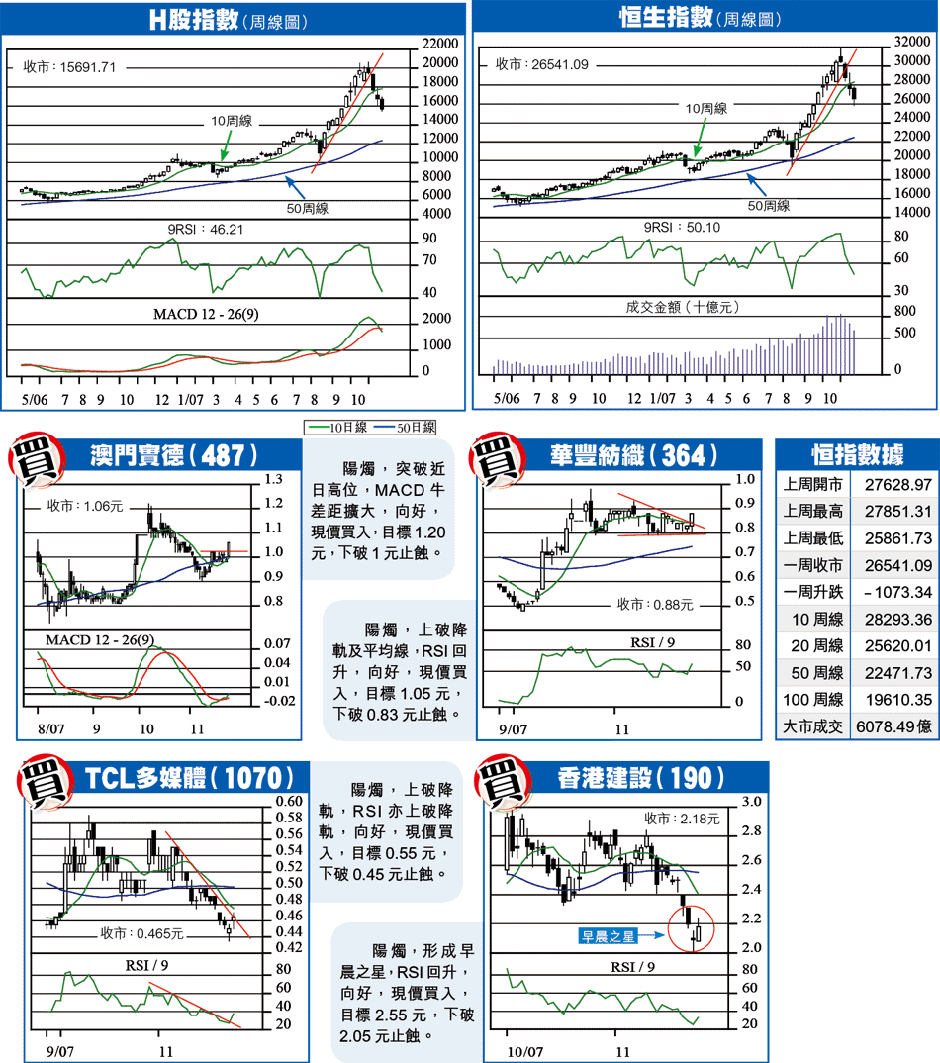 港股上周繼續下挫,波動幅度仍然大,全周跌幅雖略見放緩,但亦達1073點,已是第三周急挫,並收10周線(28293)支持之下,走勢仍然向淡,成交由前周的平均每日1403億元,減至1215億元,與高峯期相比,幾乎少了一半。