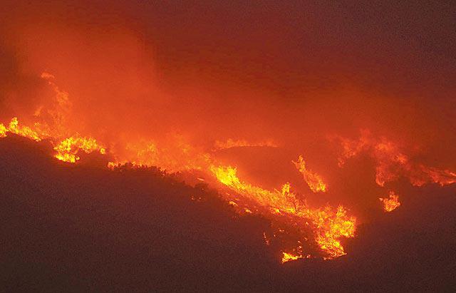 南加州現正經歷130年以來最嚴重的亁旱,加上吹襲南加州的沙漠熱風時速近100公里,都助長火勢蔓延,有消防員說一些火柱高達23至30米。加州動員了1,700名消防員撲火,並派出15架直升機、12架定翼機不斷在上空灑水和噴射化學泡沫。當局正調查起火原因,初步懷疑有露營人士留下火種。