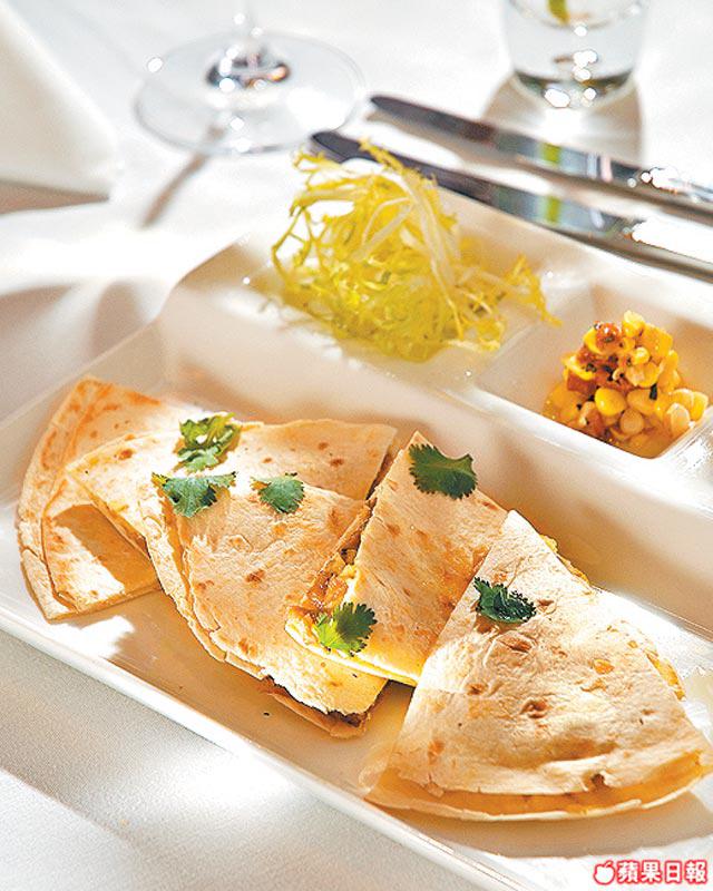 墨西哥烤餅內夾有牛仔肉跟自製牛油果醬,最特別是加了中國葱白,跟南美香料錦上添花。這是午餐主菜,連頭盤及湯三道菜。