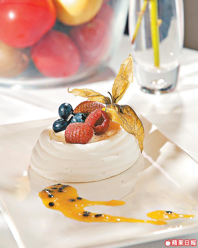打好的蛋白經過沒有水氣的低溫焗製,須焗足一天。蛋白軟綿滑溜,配雜草莓、忌廉及熱情果製成的醬汁,極具特色。