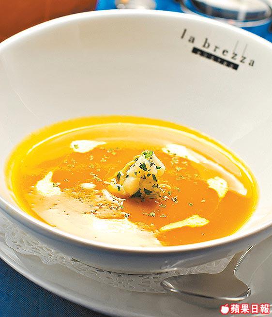 將醃製過的帶子切粒,撞入以南瓜、洋葱、薯仔打成的南瓜湯,帶子七、八成熟,連湯入口,又香又滑。