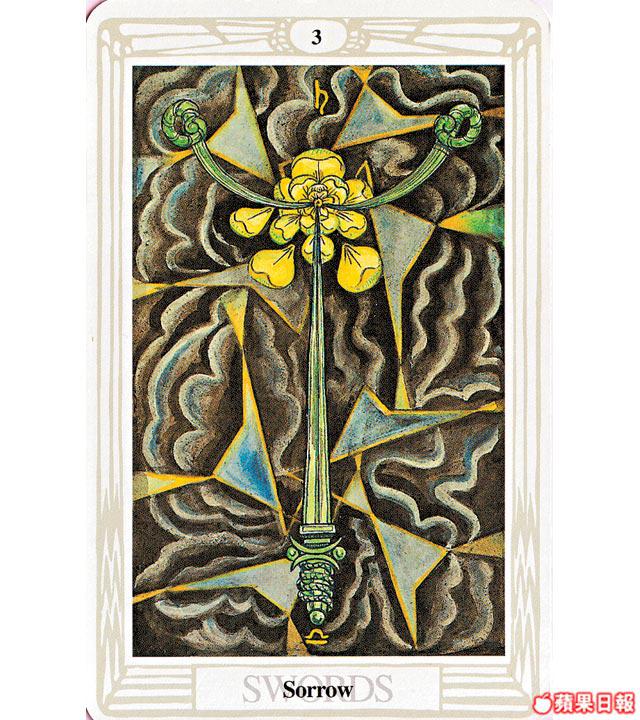 在文文詢問的二人關係中,為何要將凌亂的思緒回復平靜呢?且看她所問的那個「他」的牌便一清二楚。文文抽出的是「寶劍3:對不起」(Sorrow),於上幾次文章也介紹過,土星進入天秤座,正代表對方正慢慢離開這個關係,文文也察覺到他們的前景是漆黑一片,原先會結果實的花也散開了。彎曲的劍正代表他對這關係的扭曲負面想法,他只能對文文說一句:「對不起!」