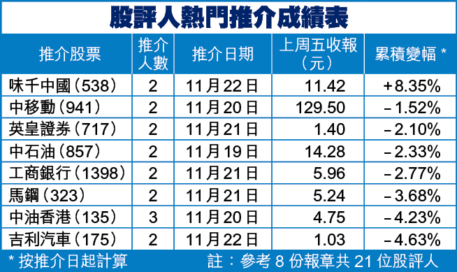 芸芸股評人推介的股票當中,以從事銷售日本拉麵和日本菜式的連鎖經營商味千中國(538)升幅最顯著。味千中國在今年首季季末上市,增長來自內地龐大消費市場,集團已有計劃在下年年底擴展零售店至330間。味千中國中期純利增長90.6%,期內營業額上升41.6%,主要受惠於控股獲利息收入及炒股獲利;目前內地消費者對有品牌及日式食品的需求有增無減,股評人皆看好其內地消費概念,股價大升8.35%。