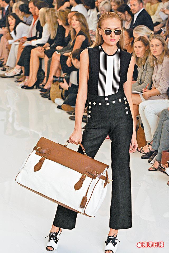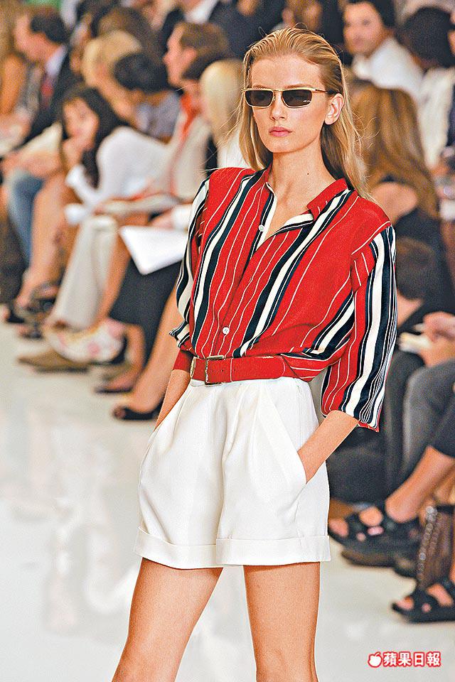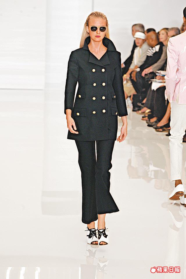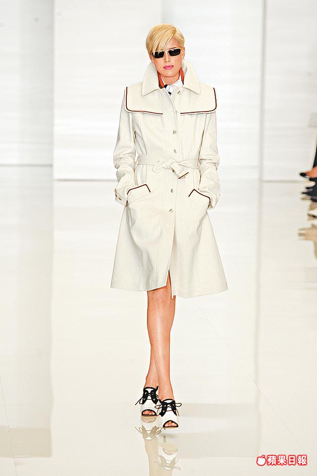 項目配搭有tuxedostyledtankdress、brass-buttonedcoatdress、pipetrench、繫以sailor-belt的裙子、cableknit配褲子、紅白blazer襯chiffondress、奪目的橙色blouse配襯必然的卡其調長褲。