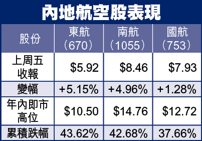 以上周五中港股市走勢看,航空股已有起跑迹象,當中以南航A股反彈力度最大,強勢漲停板,其H股亦升4.96%,收報8.46元。內地券商認為,雖然油價仍然高企,但隨着燃油附加費上調,航空公司已可抵禦油價上漲的影響,航空股近期走勢亦顯現了其上漲動力。