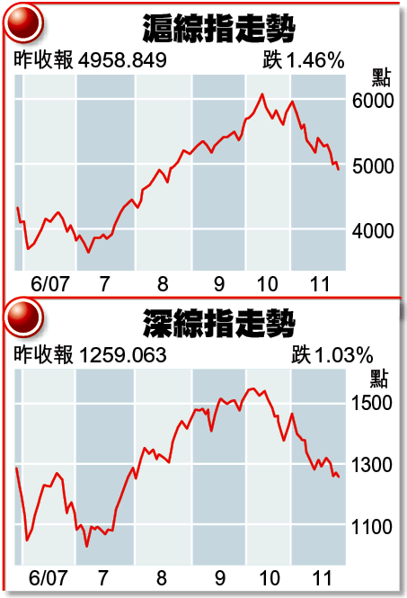 昨日《人民日報》亦在其經濟周刊首版發文提示通脹風險,指不排除央行出台新的調控措施。滬深股市昨高開低收,由升超過1%轉為下挫逾1%,滬綜指再度失守5000點,收報4958.85,跌73.28(1.46%)。深綜指則收報1259.06,跌13.08(1.03%);滬深300指數收4800.08,跌56.08(1.15%),三指數皆以近全日低位收市,兩市總成交899.18億元(人民幣.下同)。