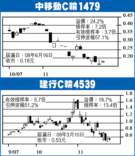 ■中移動C輪1479上周收0.18元,比周四升0.015元,成交4361球。此輪08年6月16日期滿,行使價142.80元,溢價24.2%,槓桿率7.2倍,有效3.7倍,引伸波幅57.1%,街貨19.4%。正股見140.40元,此輪理論價0.24元,升33%。