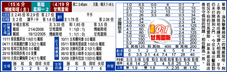 今季淪為葡超下游球隊的博維斯塔,至今尚未開齋且剛遇大敗,今仗重返主場迎戰今季異軍分子之一的甘馬雷斯不宜看好,平手盤當取連續3場不敗兼狀態不俗的客軍!