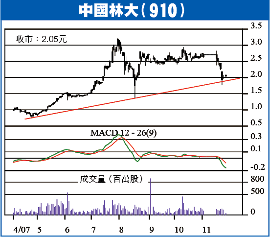 早輪林大宣佈收購神宇後,旋即見基金大舉沽貨,股價由2.8元一直插到落1.77元後才反彈,主要係芬佬對林大收購緬甸資產有所保留,而林大亦順應「民」意,只收購中國的林木資源同生物柴油項目,相信這亦係基金沽盤突然收晒的主要原因,只要佢哋重新入市,股價會大幅反彈。