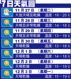天文台表示,一股強烈東北季候風未來數天為華南沿岸地區帶來顯著較凉天氣。未來一、兩天,颱風米娜會向東北移動,橫過呂宋海峽。今日氣溫介乎16至20度,明天降至14至18度,周四及周五會降至最低13度,最高只有18度,天晴亁燥。氣溫要到周六才稍微回升至14至18度,周日15至19度。