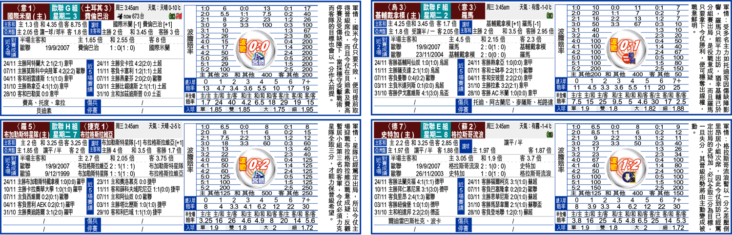 星期二2基輔戴拿模細(1.88)x星期二3國際米蘭細(1.95)x星期二7布加勒斯特星隊細(1.72)3x1