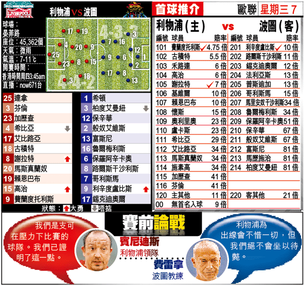 先說說形勢,利物浦出閘脫腳,頭3場竟得1分,現4戰4分排第3位,要是同日馬賽從比錫達斯贏波而回,而他們又未能在波圖全取3分,便緣盡16強,故今仗是非勝不可。