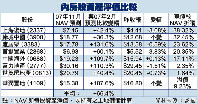 花旗相信,內地發展商會繼續增加土地儲備,令資產淨值提高,故看好業內具實力的企業,包括華潤置地、中國海外(688)、中渝置地(1224)、方興地產(817)和合景泰富(1813)。內房股昨普遍跟隨大市表現偏軟,首創和復地均跌逾3%。
