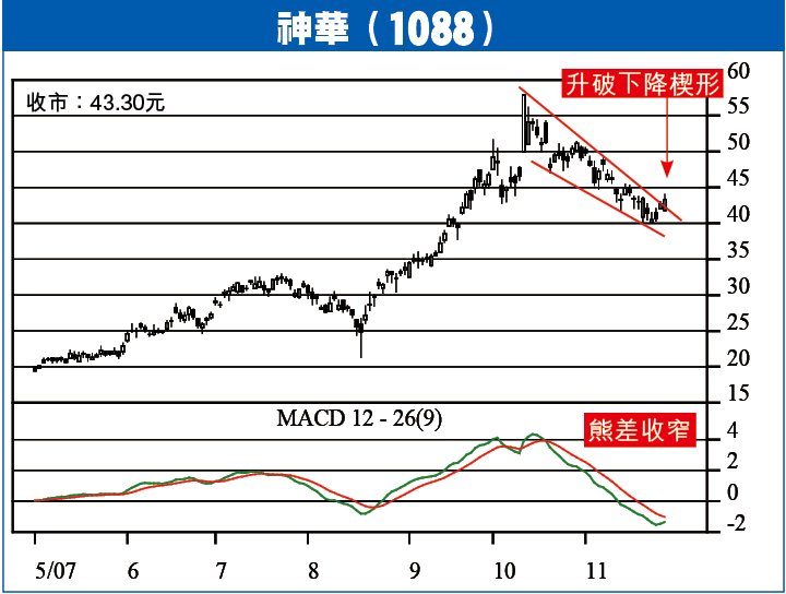 買賣策略:神華已升破下降楔形,MACD熊差持續收窄,43至44元買入,短線目標50元,跌穿40元止蝕。