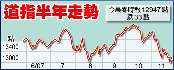 道瓊斯工業平均指數最多升56點或0.43%,見13037點;納斯達克綜合指數曾升17點或0.66%,至2613點。開市後個半小時(本港時間今晨零時),道指跌33點,報12947點;納指跌9點,報2586點。