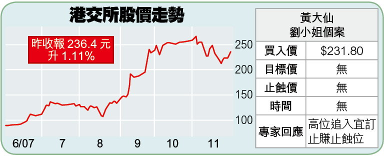 黃大仙劉小姐噚日推介港交所(388),佢自己喺一個月前以每股231.8元入咗貨,劉小姐話:「炒佢有直通車概念。」正如黃敏碩所講:「直通車普遍都覺得今年唔會通。」孫柏文更謂:「資金自由行好似八萬五,唔講等於無咗。」