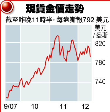現貨金價本月迄今已回升近4%,周三收813.48美元,但昨出現技術調整,金價跌逾20美元,降至每盎斯792美元。