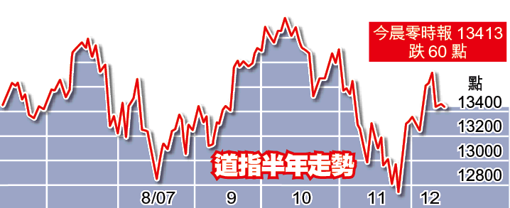 道瓊斯工業平均指數早段最多跌86點或0.65%,見13386點;納斯達克綜合指數曾挫21點或0.82%,至2649點。開市後個半小時(本港時間今晨零時),道指跌60點,報13413點;納指跌19點,報2651點。