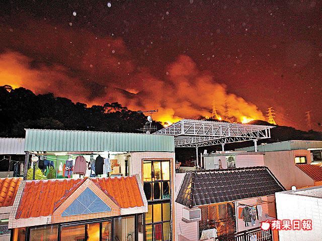 昨晚火勢越燒越烈,菠蘿山一帶火光熊熊,並形成三條每條兩公里長的火龍,火場面積達180公頃。晚上9時,火舌逼近楊小坑村及青山禪院,最近只有幾百米,由於情勢危急,警方將150多名村民及僧人疏散到安全地方,村民被安置到山景社區會堂暫避,至深夜11時半各人始能返家。消防處出動18部消防車及1部救護車,近100人撲救,民安隊亦到場協助。