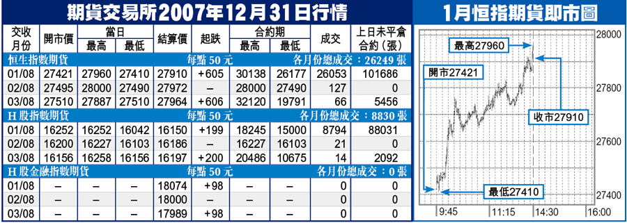 港股在2007年最後1個交易日回升,出現粉飾櫥窗效應,期指動力突然再增,於10日線之上反彈,貼近28000水平,依然內困在預期波幅區,技術指標略為回升,不過,在低成交量下,短期未必可克服50日線阻力,估計假期後仍反覆。14RSI反彈至49,隨機指數亦回升,大市處密集區,中線的波浪結構有利,只要守於26000,第1季可望重上3萬點。