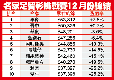 簡評:你可記得,曾多少次受惠於畢傑在英超早飛及西甲的高水準推介?兩年來終首嘗每月擂台挑戰賽的冠軍,不僅是畢傑自己,連各同事都為他感到快慰。但願畢傑仔強勢可在08年持續,並早日與愛人拉埋天窗!曼聯、利物浦在年底最後一仗失分,加上荷甲的阿積士持續不振,都令不少名家損手,故12月只得畢傑及吾中以正分過終點,成績未如理想。