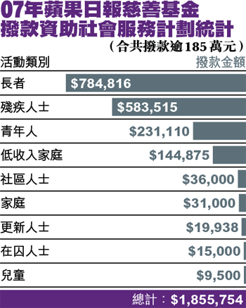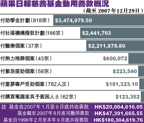 去年直至9月30日止,蘋果日報慈善基金收到給予指定及非指定受惠人的善款共逾2千萬元。除了給予指定受惠人的捐款,蘋果日報慈善基金去年共撥款逾82萬元,幫助逾100個沒錢殮葬或遭遇突發事故(如工傷或意外)而經濟陷入困境的家庭,跨過難關。另又撥款逾12萬元援助大批長者及有需要家庭購買基本家庭電器,改善生活質素。此外,讀者的善款為不少患重病人士延續生命,去年透過基金撥款協助接受治療的個案共37個。