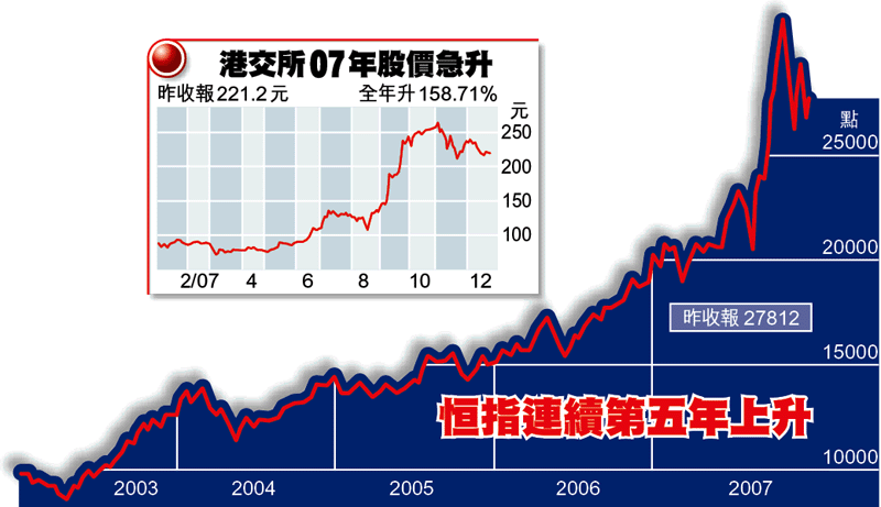 【本報訊】港股2007年威盡!連續第五年上揚外,恒生指數全年爆升39%,為過去8年以來最勁,於發達地區股市中,回報傲視同儕。去年投資者雖頻坐股市過山車、目睹大時代奇迹日,然而大部份埋單計數仍有斬獲,寄望今年再接再厲,在股場上繼續淘金! 記者:黃武榮