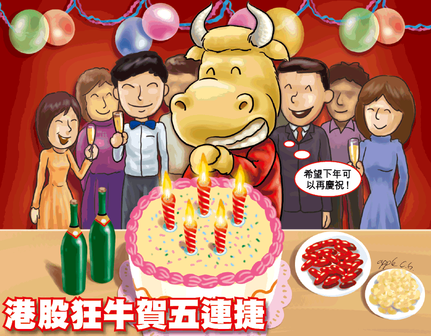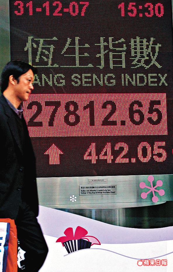 亞太區多國昨假期休市,港股則於最後半日市漲442點或1.6%,報27812點,全年累計飆7848點,以點數計為歷年最勁,升幅39.3%則是繼99年升68.8%後,過去8年以來最大升幅。港股五連捷,是88至93年連升6年後,歷來第二長升市。