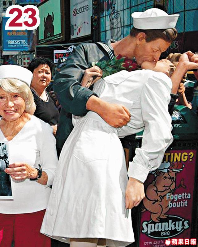 23.二次大戰宣佈結束時,興奮的水手隨街親吻不認識的女護士,經典攝影《勝利日之吻》後被複製成豎立紐約街頭的雕塑,再被後人模仿過千萬次。