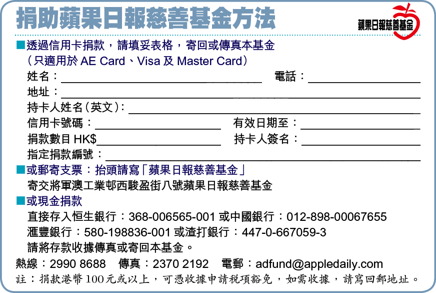 蘋果日報慈善基金將按照捐款人意願,把善款送交指定受惠人,由於有些受惠人因搬遷等原因失去聯絡,本基金仍會盡力聯絡指定受惠人送交捐款,如在收到善款後一年內,仍無法聯絡指定受惠人,本基金將把捐款全數撥捐蘋果日報慈善基金作其他慈善用途。